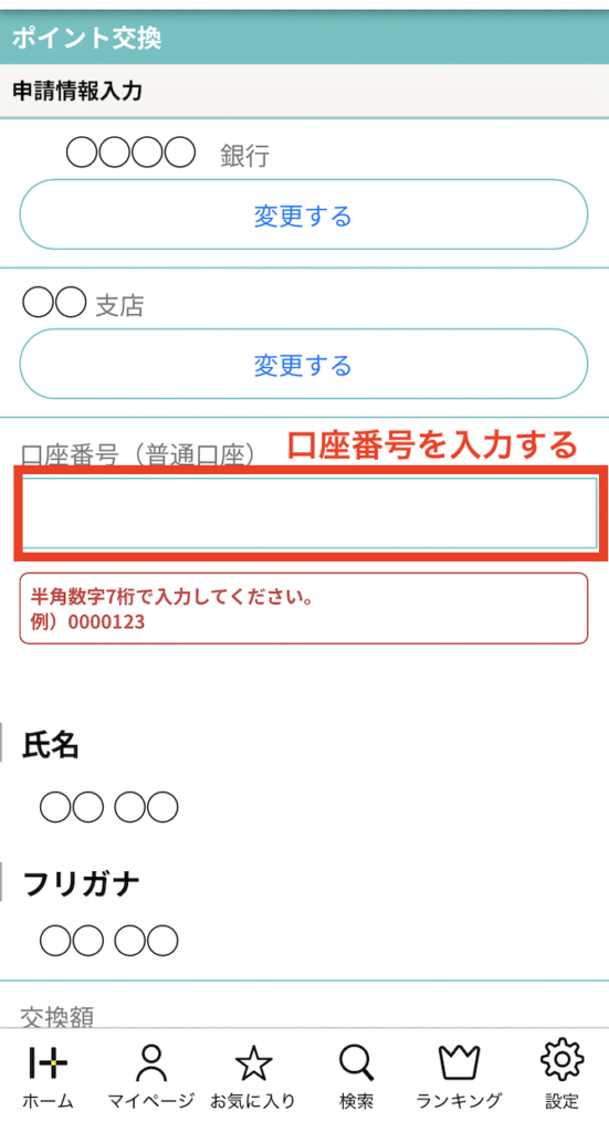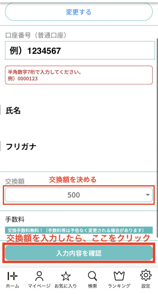 振込先が決まったら、口座番号を入力して交換額を決めます。