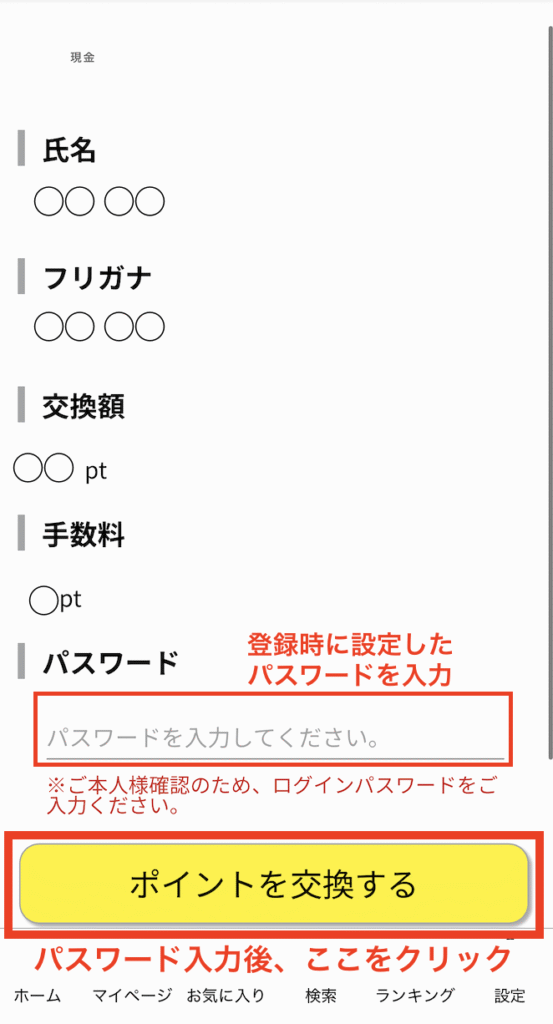 会員登録時に決めたパスワードを入力して、『ポイントを交換する』と書かれてあるボタンをクリックします。
