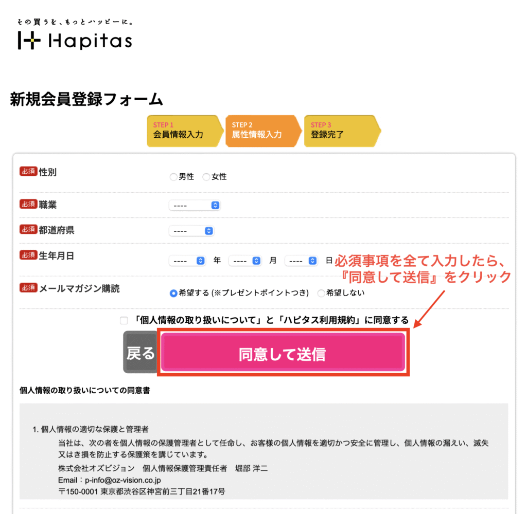 必須事項を全て入力出来たら、『同意して送信』と書かれてあるボタンをクリックします。