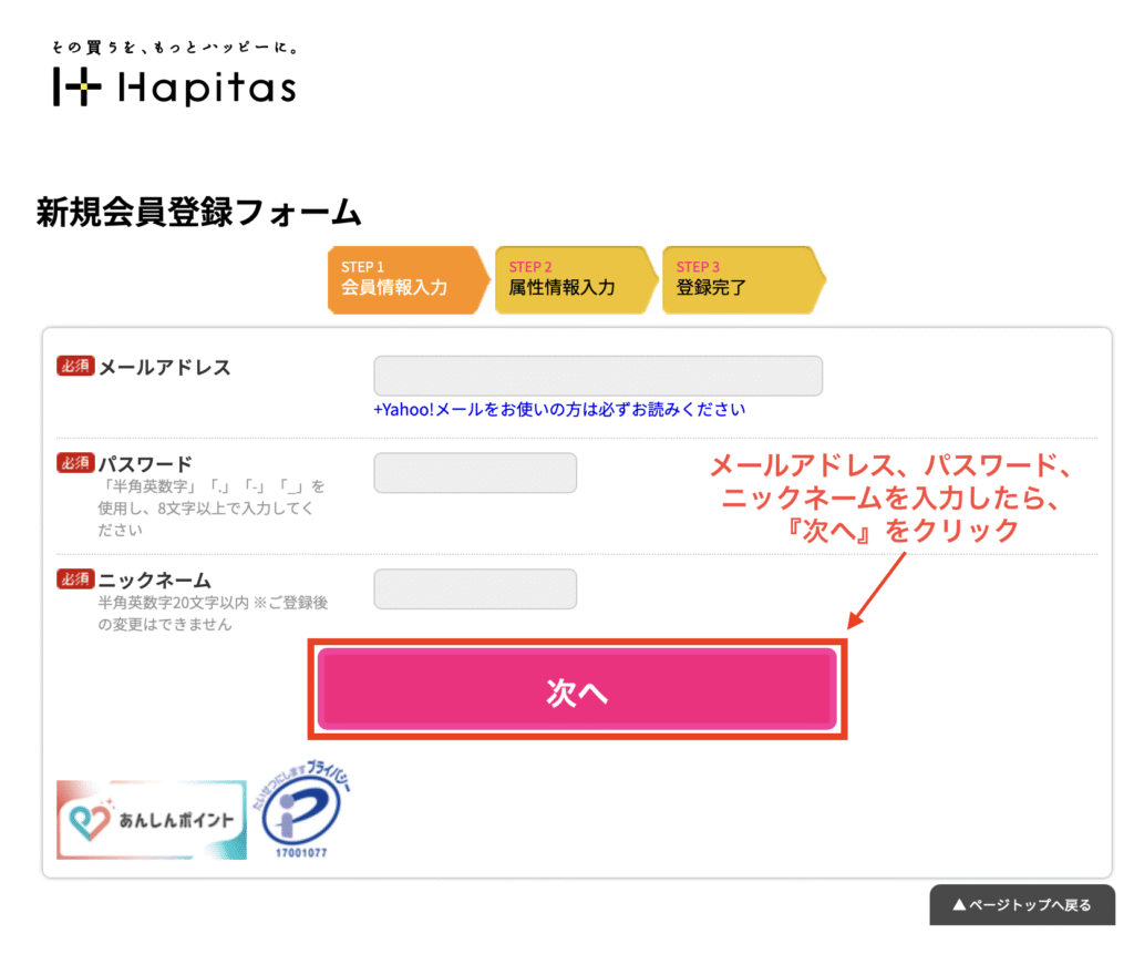 次にメールアドレス、パスワード、お好きなニックネームを入力します。